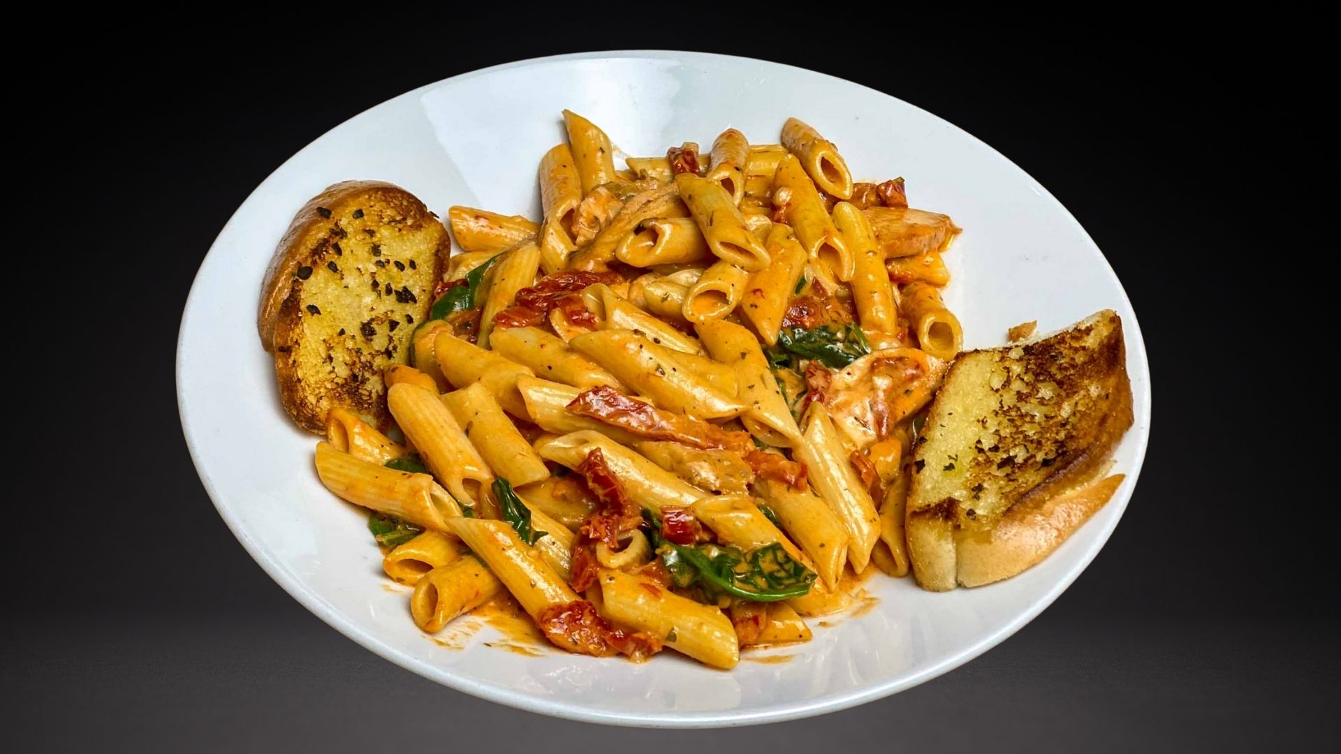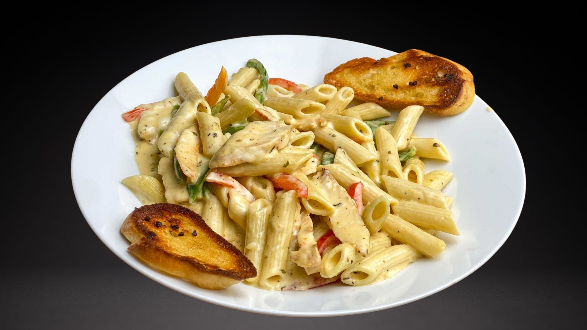 Sauteed sweet peppers and chicken with a touch of spice in cream of Alfredo sauce.