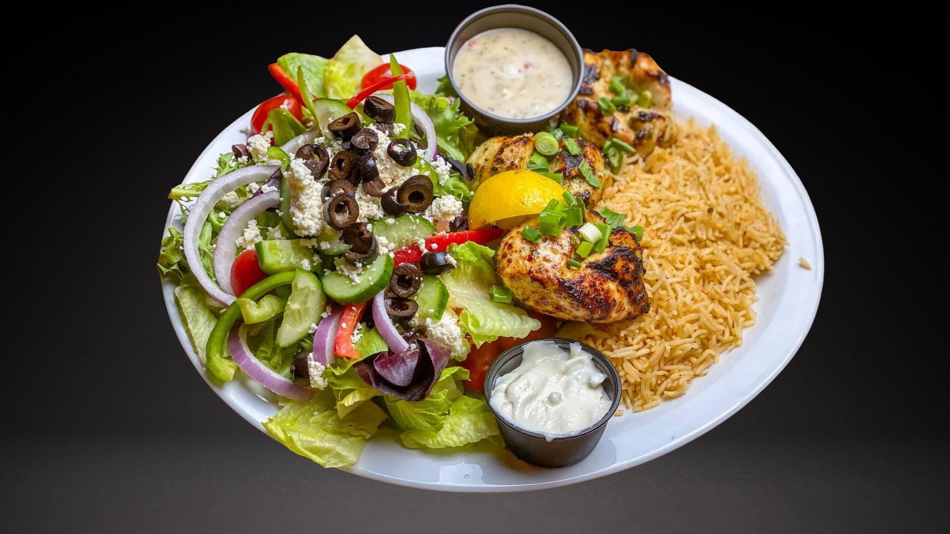Greek spiced grilled chicken served with Greek salad, rice, and tzatziki sauce.