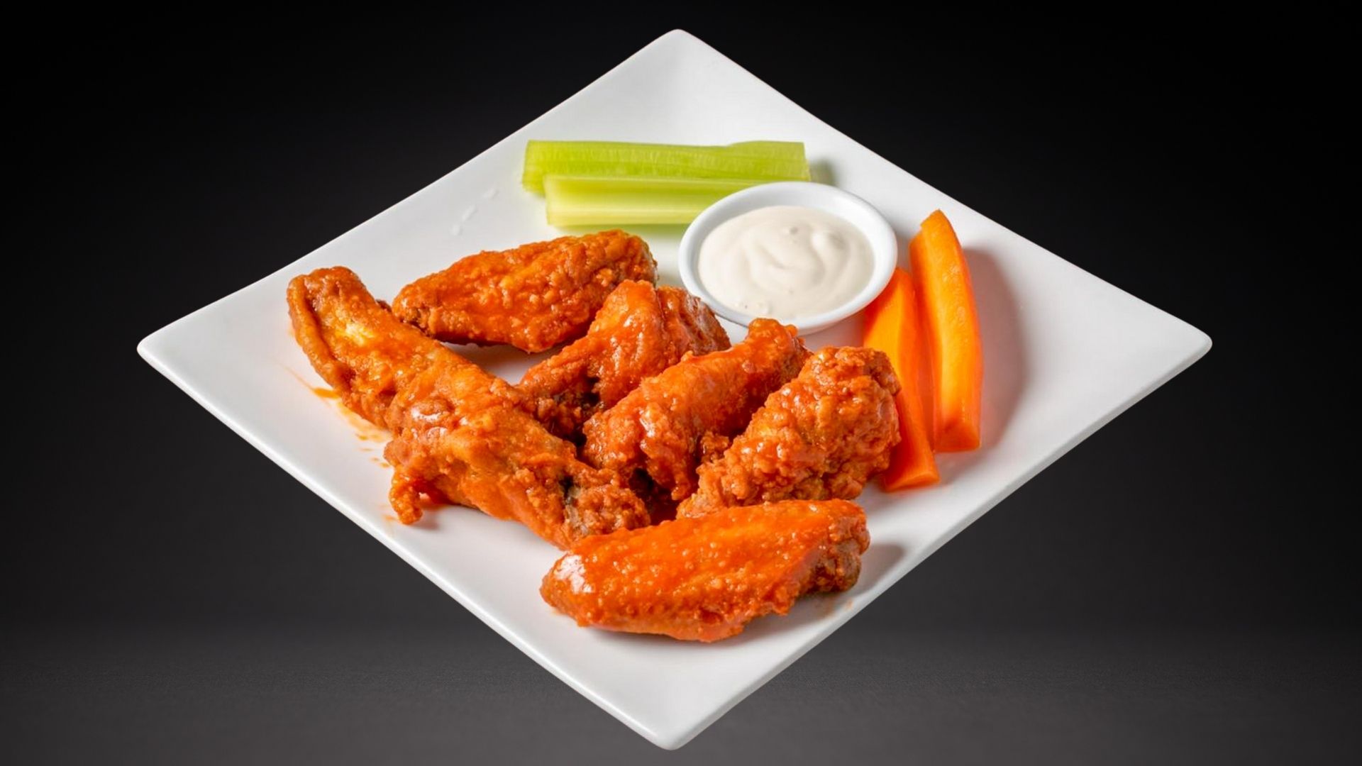 Lightly dusted, fried then tossed in choice of sauce. Served with carrots, celery, and choice of blue cheese or ranch.